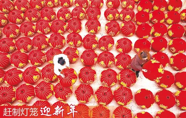 12月22日,贵州省黔东南苗族侗族自治州丹寨县金钟经济开发区一家灯笼厂里,工人正在晾晒制作好的灯笼(无人机照片)。新年临近,工人忙着赶制各式灯笼,供应节日市场。新华社发
