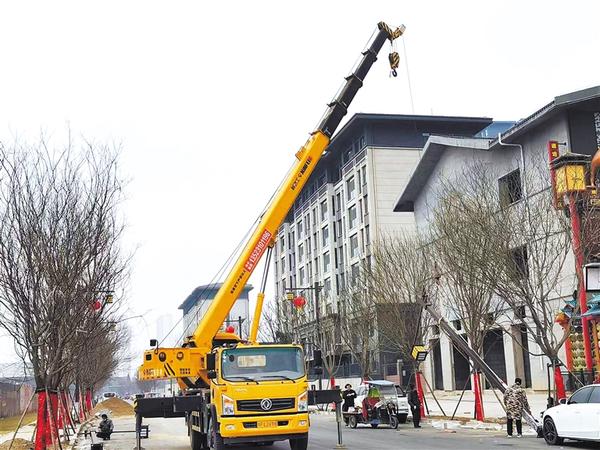 庆丰路西段修建工程正在安装路灯。记者 梁照曾 摄