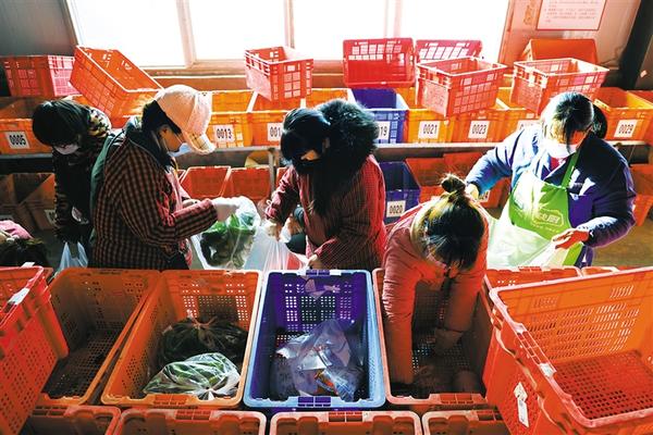 淮阳区多多买菜分拣中心工人正在分拣订单。连日来,淮阳区拼多多旗下多多买菜分拣中心工人每天凌晨两点就开始忙碌起来,将全区居民前日下单的乳品冲饮、时令蔬菜、新鲜水果、休闲零食进行分拣装车,目前该区域日订单量已接近2万单。记者 刘俊涛 摄