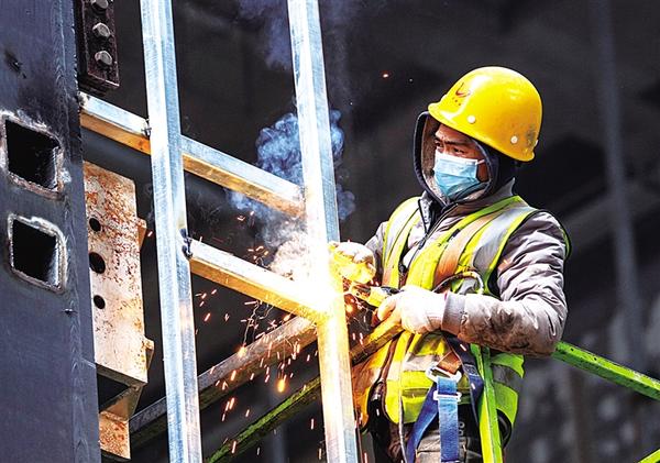 2022年12月31日,工人在京东方(重庆)智慧系统创新中心项目施工现场进行施工作业。元旦假期期间,京东方(重庆)智慧系统创新中心项目施工现场一派繁忙景象,100多名建设者抢抓工期,坚守在岗位上进行外墙玻璃、铝单板、陶板的安装工作。 新华社发