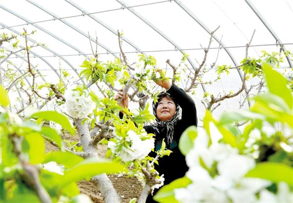 1月6日,在秦皇岛市海港区海阳镇一家樱桃种植合作社,农民在大棚内给樱桃树疏花。近年来,河北省秦皇岛市海港区根据当地气候和土壤特点,通过“合作社+基地+农户”的模式,发展樱桃种植,促进农民增收,助力乡村振兴。新华社发