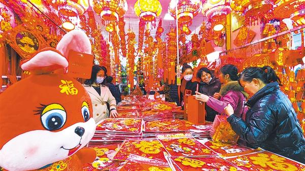 1月11日,在湖南省常宁市宜阳街道农贸市场,人们在挑选春节饰品。 春节临近,各地年货市场红红火火,人们忙着选购年货,喜迎新春佳节。 新华社发