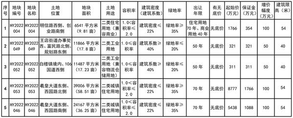 备注:1.具体建设方案须报规划部门批准后实施,土地出让合同签订后,12个月内必须开工建设,工期35个月,土地成交价款需在土地出让合同签订后60日内交清,交地时间6个月内。2.HY2022004号宗地地块内兼容商业设施建筑面积不得超过地上总建筑面积的10%,土地出让合同签订后,12个月内必须开工建设,工期35个月,土地成交价款需在土地出让合同签订后30日内交纳50%,受让人在支付第二期及以后各期国有建设用地使用权出让价款时,按照支付第一期土地出让价款之日中国人民银行公布的贷款利息向出让人支付。交地时间12个月内。3.HY2022052号地块为工业用地“标准地”出让,“标准地”控制性指标为入驻该宗地的具体产业类型为纺织业,投资强度不低于260万元/亩,亩均税收不低于6万元/亩,行政办公和生活服务设施用地占地面积不得超过总用地面积的7%,建筑面积不得超过总建筑面积的15%,严禁建造成套住宅、宾馆、专家楼和培训中心等非生产性配套设施。具体由周口市淮阳区白楼镇人民政府负责监督监管,竞得者需与周口市淮阳区白楼镇人民政府签订《工业用地“标准地”履约监管协议》,并出具《“标准地”企业信用承诺书》。4.HY2022049号地块为工业用地“标准地”出让,“标准地”控制性指标为入驻该宗地的具体产业类型为医药制造业,投资强度不低于260万元/亩,亩均税收不低于6万元/亩,行政办公和生活服务设施用地占地面积不得超过总用地面积的7%,建筑面积不得超过总建筑面积的15%,严禁建造成套住宅、宾馆、专家楼和培训中心等非生产性配套设施。具体由王店街道办事处负责监督监管,竞得者需与王店街道办事处签订《工业用地“标准地”履约监管协议》,并出具《“标准地”企业信用承诺书》。根据周口市淮阳区国土空间规划委员会2022年度第十五次会议研究的意见:地上资产(无规划、建设手续)价款1897107元与土地捆绑出让,土地成交后,竞得人须另将地上资产价款及时汇入河南康之美日化有限公司账户,开户行:中国建设银行淮阳支行,账号:41050170660800000296;地上资产以现状为准。5.HY2022053号宗地地块内配建配套6班幼儿园,托儿所至少配建30个托位,该宗地不再配建商业设施。土地出让合同签订后,12个月内必须开工建设,工期35个月内,土地成交价款需在土地出让合同签订后30日内交纳50%,12个月内交清,受让人在支付第二期及以后各期国有建设用地使用权出让价款时,按照支付第一期土地出让价款之日中国人民银行公布的贷款利率,向出让人支付利息。交地时间12个月内。6.HY2022046号宗地不再配建商业设施。土地出让合同签订后,12个月内必须开工建设,工期35个月内,土地成交价款需在土地出让合同签订后30日内交纳50%,12个月内交清,受让人在支付第二期及以后各期国有建设用地使用权出让价款时,按照支付第一期土地出让价款之日中国人民银行公布的贷款利率,向出让人支付利息。交地时间12个月内。7.根据淮政{2019}45号文件精神,竞得人摘牌土地后,应将项目施工标发包给在淮阳设立公司的施工单位;房地产开发项目非淮阳境内企业竞买人在竞买申请时,申请书中应明确成立新公司、公司出资构成及成立时间。8.土地竞买保证金必须以竞买申请人(单位)自身的名义交纳,竞买申请人(单位)与交款人(单位)名称不一致的,无法确认其竞买资格,交纳款项无效。9.具体以规划部门出具的规划指标为准,详见规划设计条件或批复文件。