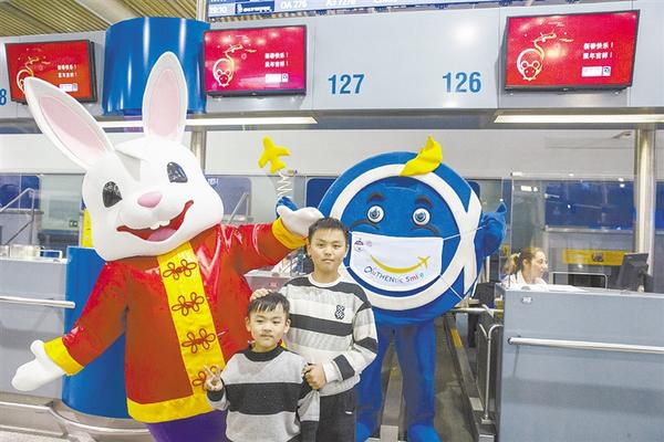 1月26日,在希腊雅典国际机场,两名准备搭乘航班前往中国的小乘客与装扮成兔子造型的工作人员合影。 中国农历兔年春节期间,希腊雅典国际机场推出兔子吉祥物,为乘客送上吉祥与欢乐。 新华社发(马里奥斯·罗洛斯摄)