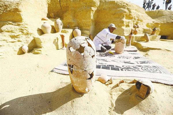 这是1月26日在埃及塞加拉地区考古发掘现场拍摄的一件被修复的陶器。 埃及著名考古学家扎希·哈瓦斯26日宣布,考古学家在首都开罗以南的塞加拉地区发现多座古埃及古王国时期墓葬,其中包括一具迄今为止在埃及发现的最古老、最完整的非王室木乃伊。新华社发(艾哈迈德·戈马摄)