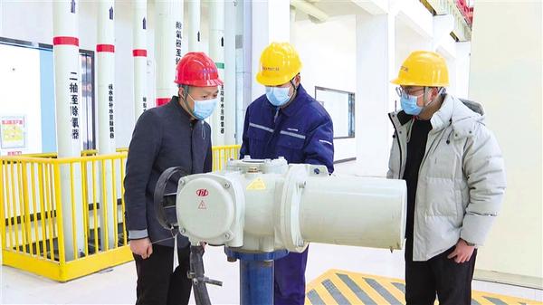 春节期间,记者在扶沟县先进制造业开发区内的多家企业看到,生产有条不紊,员工干劲十足。图为周口海创环境能源公司员工在商讨技术方案。 记者 金月全 摄