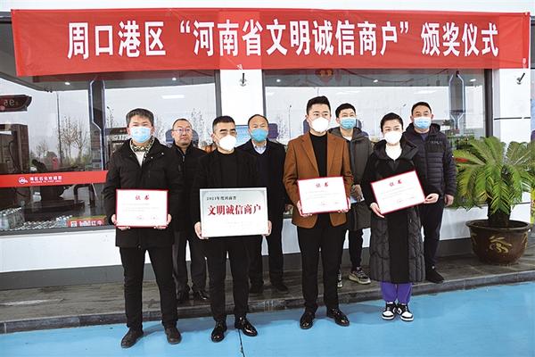 本报讯(记者 宋风 通讯员 王燕 李锐龙 文/图) 为进一步增强市场主体文明经营、诚信经营、合法经营的意识,深化全国文明城市创建工作,近日,周口港区举办“河南省文明诚信商户”颁奖仪式,对当选商户进行表彰。