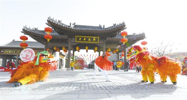 关帝庙,周口文化的根魂之地,周口商业的龙兴之地,栉风沐雨三百余载,见证了昔日“万家灯火侔江浦,千帆云集似汉皋”的繁盛,也见证着新一代周口人的励精图治。 建业集团与周口市政府签订500亿元战略合作协议实施的重要文旅项目——关帝老街项目,一期已经开街,“传承周口源城市文脉,赓续千年古镇盛景”,有望成为周口历史文化名城建设中的一颗明珠。图为关帝老街前的舞狮表演。②18记者 梁照曾 摄