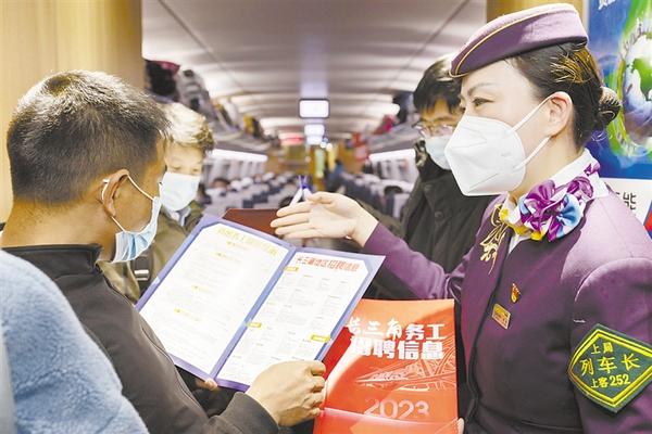 近日,针对长三角地区节后务工流特点,铁路上海客运段在阜阳开往上海的G7445次列车上开展就业服务“春风行动”,为进城务工旅客提供上海、苏州、杭州等长三角地区就业信息,发放包括服务、物流、餐饮、家政、制造业等多个行业的300余个岗位招聘信息,帮助他们提前了解用工信息,促成企业和务工人员“双向奔赴”。新华社记者 王翔 摄