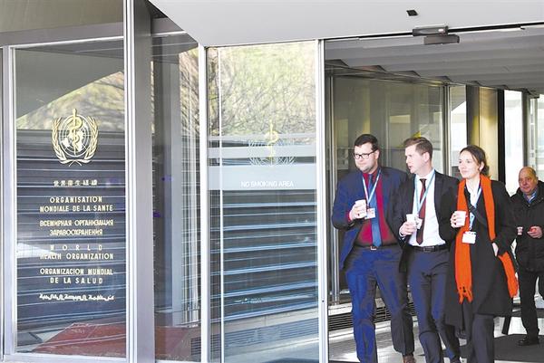 1月30日,在瑞士日内瓦,工作人员走出世界卫生组织总部大楼。