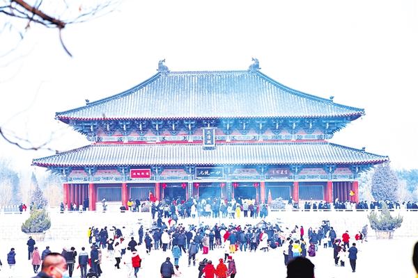 春节期间,鹿邑老子故里旅游区多项民俗文化活动轮番上演,吸引大量游客前往观看,带来了久违的年味和烟火气。图为群众到三清殿祈福。