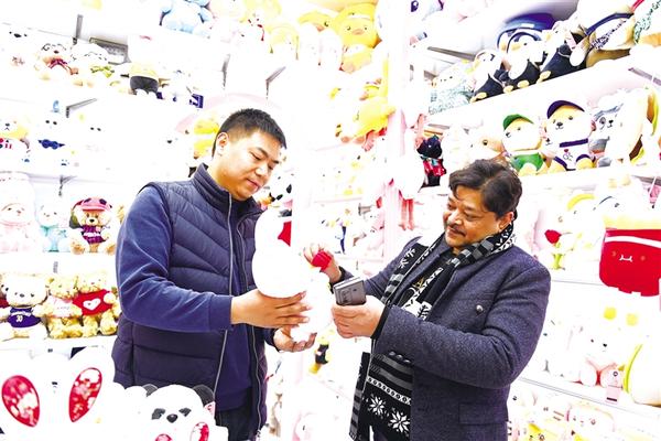 2月2日,来自印度的客商拉贾(右)在义乌国际商贸城的一家玩具店铺内选购。