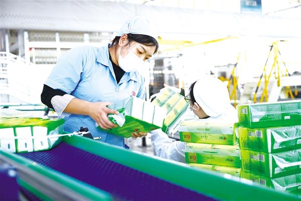 2月2日,在位于泉州市晋江市的恒安集团,员工在包装流水线上检验产品。