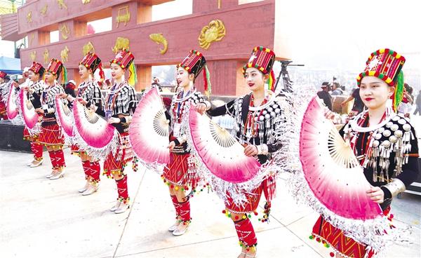 2月5日,在云南省德宏傣族景颇族自治州陇川县,少数民族群众载歌载舞,共庆佳节。新华社发