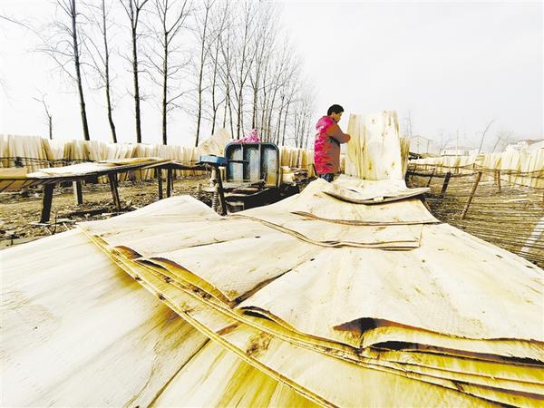 淮阳区刘振屯镇依托丰富的木材资源积极谋划板材加工项目,年加工木材50万余立方米,累计为13000余人提供就业岗位。图为2月7日,刘振屯镇一家板材加工企业的员工在晾晒旋切好的木材。