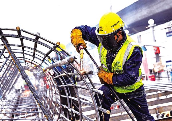 在天津地铁8号线一期工程5标项目南珠桥站施工现场,建设者进行焊接作业(2月11日摄)。