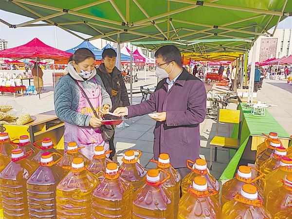 近日,在鹿邑县首届年货节上,鹿邑农商银行工作人员开展走访调研,了解商户的资金需求。张曼 摄