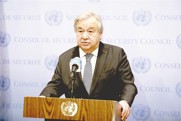 2月14日,在位于纽约的联合国总部,联合国秘书长古特雷斯发表讲话。