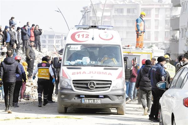 2月13日,在土耳其哈塔伊省安塔基亚市,救护车停在地震废墟旁。 据土耳其官方最新消息,6日发生在土耳其南部的强震已造成该国至少35418人死亡,105505人受伤。新华社发