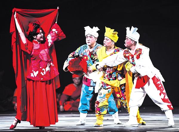 2月16日在首届中国非物质文化遗产保护年会展演活动上拍摄的陕北秧歌剧《米脂婆姨绥德汉》演出现场。