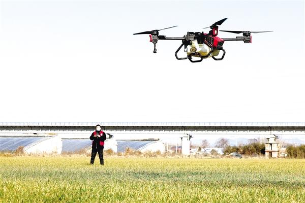2月19日,在山东省枣庄市光明路街道丁庄村麦田里,农业技术员操作植保无人机给小麦喷施叶面肥。