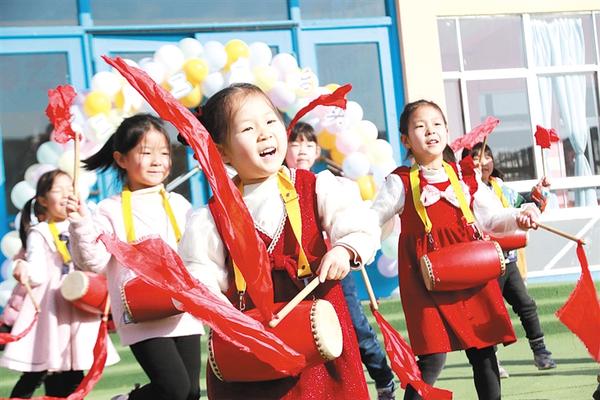 2月20日,山东省高密市密水街道中心幼儿园的孩子们在打腰鼓。 新华社发