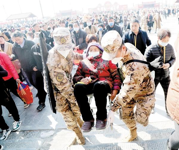 农历二月二,淮阳朝祖会如期进行,为有效应对朝祖会第一天出现的大客流,2月21日,武警周口支队出动官兵,维护朝祖会安全秩序。