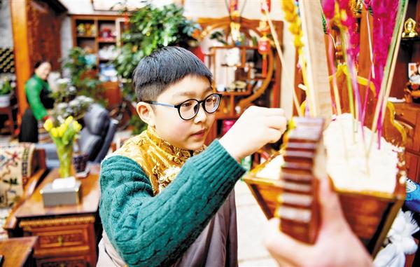 2月21日,在西藏拉萨,身着藏装的小朋友在吃寓意五谷丰登的“切玛”。