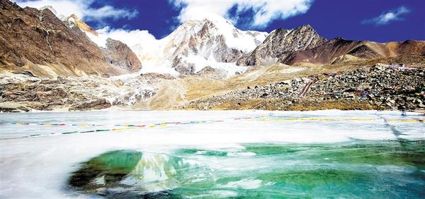 这是琼穆岗嘎冰川上的一处冰湖(2月20日摄)。 西藏拉萨市尼木县境内的琼穆岗嘎峰海拔7048米,是念青唐古拉山脉南端最后一座高峰。琼穆岗嘎冰川气势恢宏,冰臼湖群点缀其间,湖水结冰后呈现出梦幻般的色彩,恍若仙境。新华社发