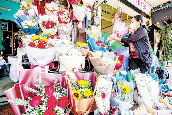 2月21日,商贩在泰国曼谷帕空鲜花市场手捧来自云南的鲜花。