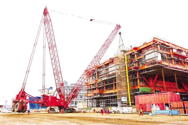 2月22日,渤中19-6凝析气田一期CEPA(中心处理平台)组块建造现场正在进行吊装作业。