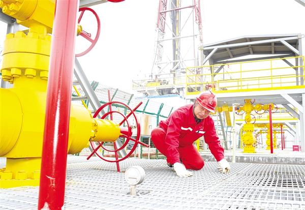 2月21日,中国石化江汉油田涪陵页岩气公司的技术人员在涪陵页岩气田焦页12号平台内对投产的页岩气井进行观测巡护。