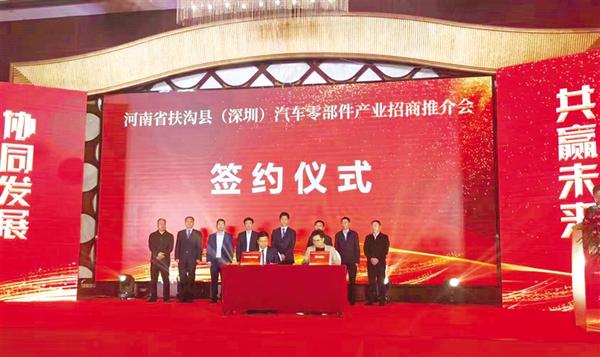 本报讯(记者 金月全 文/图)2月16日下午,扶沟县(深圳)汽车零部件产业招商推介会在深圳市成功举行,环辉汽车零部件、广浙汽车零部件、誉鑫科技等8个项目现场签约、达成合作,合同总投资额达15亿元,为该县汽车零部件产业集群化发展注入新动能。这是扶沟县深入贯彻党的二十大精神,壮大实体经济,强化产业支撑,着力构建现代产业体系的具体实践。