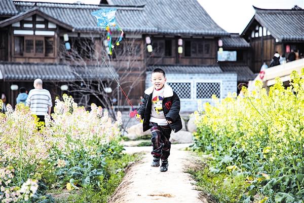 2月25日,在四川省宜宾市翠屏区李庄古镇月亮田景区,一名小朋友在盛开的菜花田边放风筝。彭珉翔 摄(新华社发)