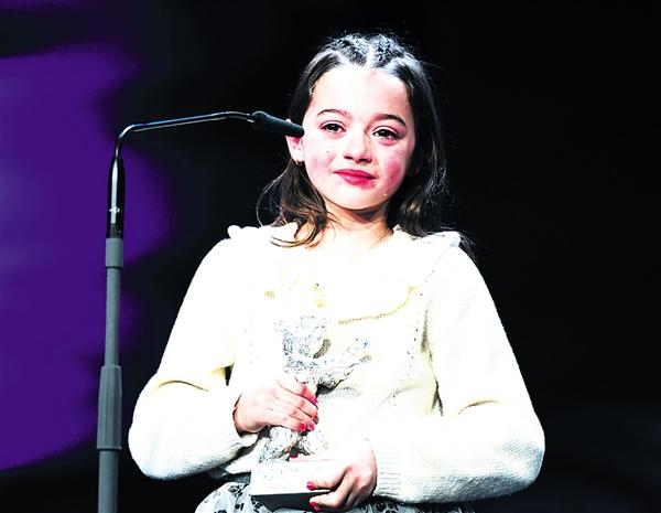 2月25日,在德国柏林,西班牙小演员索菲娅·奥特罗在颁奖仪式上领奖。索菲娅·奥特罗凭借影片《两万种蜜蜂》获得最佳主角银熊奖。 第73届德国柏林国际电影节主竞赛单元各奖项25日晚揭晓。 新华社记者 任鹏飞 摄