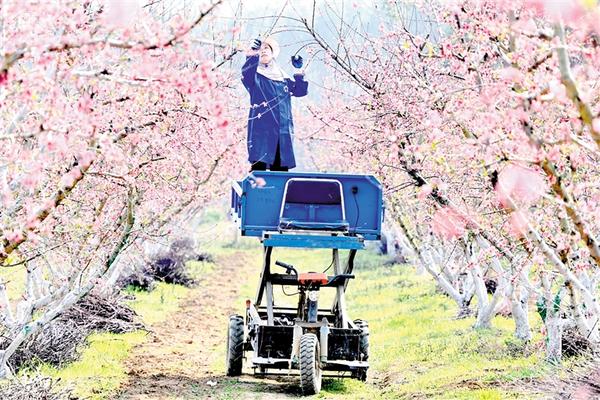 2月28日,村民在广西柳州市柳江区穿山镇林寺村鹰嘴桃种植基地进行桃园管护作业。