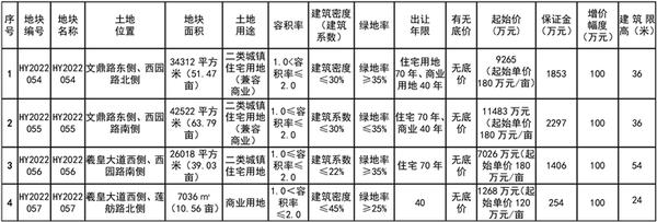 五、拍卖时间及网址 拍卖报价时间:HY2022054地块: 2023年3月23日10时,HY2022055地块: 2023年3月23日10时10分,HY2022056地块: 2023年3月23日10时20分,HY2022057地块: 2023年3月23日10时30分,拍卖网址:周口公共资源交易系统(网址:http://jyzx.zhoukou.gov.cn)。