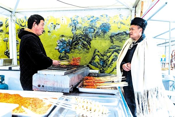 2月14日,郑望春(右)在古路村村口向村民了解烧烤小吃经营状况。