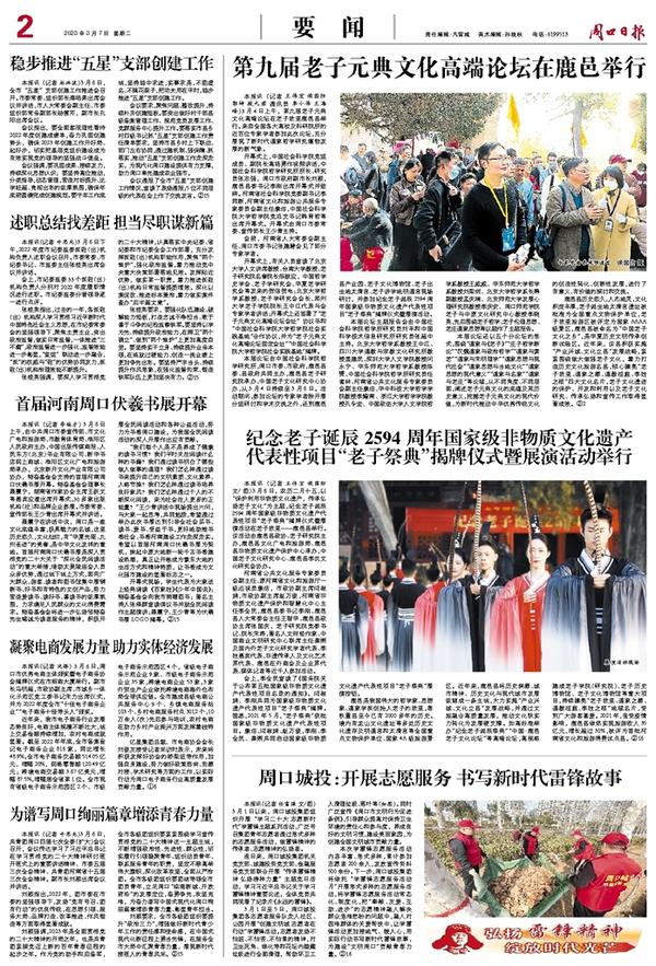 本报讯(记者 王伟宏 侯国防 文/ 图)3月6日,农历二月十五,以“保护利用非物质文化遗产,传承弘扬老子文化”为主题,纪念老子诞辰2594周年国家级非物质文化遗产代表性项目“老子祭典”揭牌仪式暨展演活动在老子故里——鹿邑县举行。该活动由鹿邑县政协、老子研究院主办,鹿邑县文化广电和旅游局、鹿邑县非物质文化遗产保护中心承办,中国老子文化研究中心、鹿邑县李氏文化研究会协办。