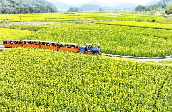 3月3日,游客在江西省婺源县严田景区乘坐“小火车”观赏花海。 新华社记者 万象 摄
