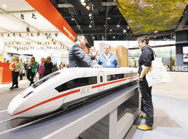 3月7日,人们在德国柏林举行的柏林国际旅游交易会德国铁路公司展区交流。