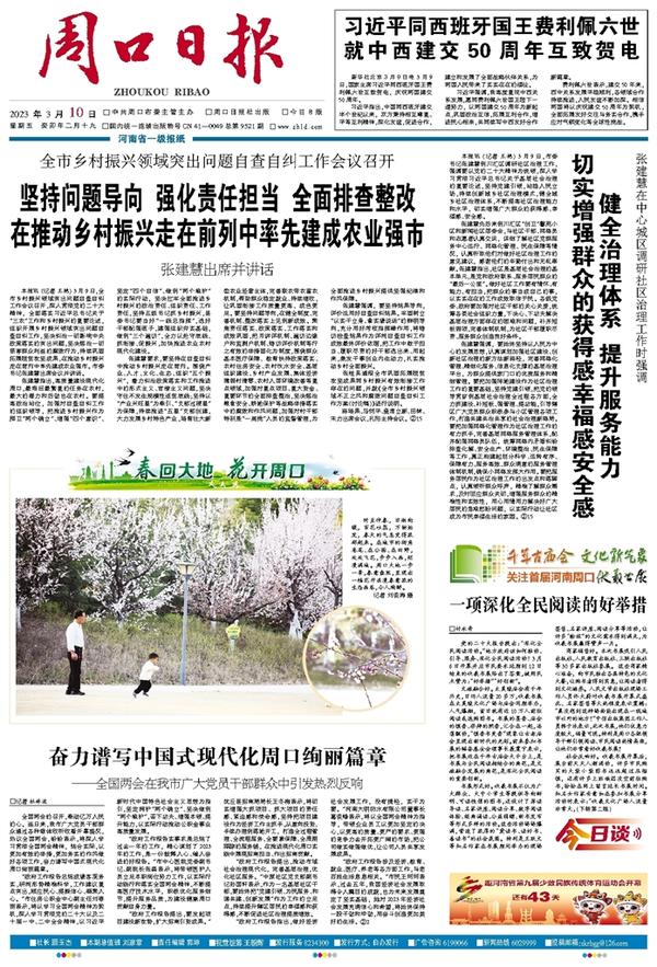 张建慧指出,高质量建设现代化周口,最艰巨最繁重的任务在农村,最大的潜力和后劲也在农村。要提高政治站位,加强对自查自纠工作的组织领导,把推进乡村振兴作为捍卫“两个确立”、增强“四个意识”、坚定“四个自信”、做到“两个维护”的实际行动,坚决扛牢全面推进乡村振兴的政治责任、组织责任、工作责任,坚持五级书记抓乡村振兴,县委书记要当好“一线总指挥”,选好干部配强班子,建强组织夯实基础,做到“三个遍访”,全力以赴守底线、抓衔接、促振兴,加快推进农业农村现代化建设。