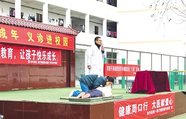 近日,西华县文明办联合县卫健委在县实验中学开展“关爱未成年、义诊进校园”文明实践活动。图为医务人员现场讲解急救知识。