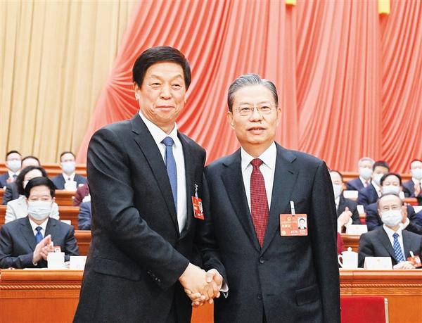 3月10日,十四届全国人大一次会议在北京人民大会堂举行第三次全体会议。赵乐际当选为第十四届全国人民代表大会常务委员会委员长。这是赵乐际同十三届全国人大常委会委员长栗战书握手,相互致意。新华社记者 李学仁 摄