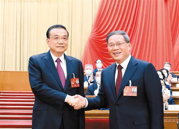 三月十一日,十四届全国人大一次会议在北京人民大会堂举行第四次全体会议,根据国家主席习近平的提名,经过投票表决,决定李强为中华人民共和国国务院总理。这是李强同李克强握手。