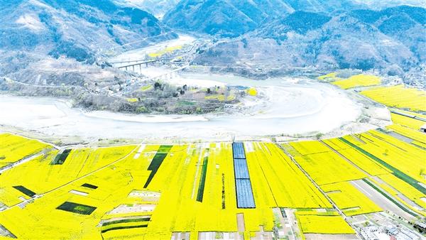 嘉陵江流经秦巴山区的陕西省汉中市宁强县燕子砭镇岛湾村时,江水在这里呈“几”字蜿蜒流淌,被称为“嘉陵江第一湾”。近日,这里盛开的千亩油菜花绵延于嘉陵江畔,掩映着白墙灰瓦的乡村民居,尽显人与自然和谐之美。