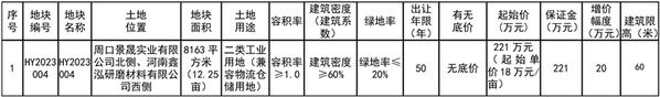 备注:(1)HY2023004号地块为工业用地“标准地”出让,“标准地”控制性指标为:入驻该宗地的具体产业类型为非金属矿物制品业,投资强度不低于260万元/亩,亩均税收不低于6万元/亩,行政办公和生活服务设施用地占地面积不得超过总用地面积的7%,建筑面积不得超过总建筑面积的15%,严禁建造成套住宅、宾馆、专家楼和培训中心等非生产性配套设施。具体由周口先进制造业开发区管委会负责监督监管,竞得者需与周口先进制造业开发区管委会签订《工业用地“标准地”履约监管协议》,并出具《“标准地”企业信用承诺书》。(2)根据淮政【2019】45号文件精神,竞得人摘牌土地后,应将项目施工标发包给在淮阳设立公司的施工单位;房地产开发项目非淮阳境内企业竞买人在竞买申请时,申请书中应明确成立新公司、公司出资构成及成立时间。(3)土地竞买保证金必须以竞买申请人(单位)自身的名义交纳,竞买申请人(单位)与交款人(单位)名称不一致的,无法确认其竞买资格,交纳款项无效。(4)具体以规划部门出具的规划指标为准,详见规划设计条件或批复文件。
