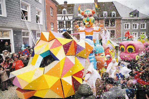 3月19日,在比利时东部的小城斯塔沃洛举行的狂欢节游行上,表演者向人们抛洒碎纸片。