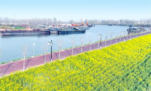 近日,位于周口临港开发区武盛大道以东沙颍河沿岸总面积1200亩、全线长度约10.5公里的油菜花竞相绽放,与繁忙的中心港码头、大广高速遥相呼应,构成一道美丽的春日画卷,为市民休闲观光增添亮丽风景。