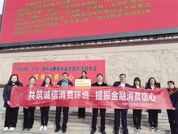 本报讯 (记者 韩志刚 通讯员 张雪 文/图) 为认真贯彻落实周口市人民银行、周口市银保监分局、周口市社会信用体系建设领导小组办公室、邮储银行省行工作要求,充分发挥国有大型银行担当,结合当前金融业消费者权益保护面临的新形势,扎实开展消费者权益保护宣传工作。近日,该行以“共筑诚信消费环境 提振金融消费信心”为主题,开展“3·15”消费者权益保护教育宣传周活动。各县支行根据市行及当地监管机构要求,同步开展该宣传活动。